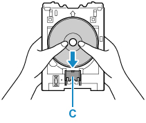 1. Aseta tulostuskelpoinen levy TULOSTUSPUOLI YLÖSPÄIN, ja paina se takaisin alhaalla lukkoa (C) vasten.