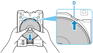 2. Kun painat lukkoa tulostuskelpoisen levyn kanssa, aseta tulostuskelpoinen levyn yläosa koloihin (D).