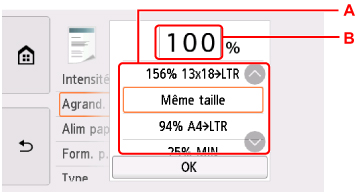 L'écran ci-dessous s'affiche lorsque vous sélectionnez Paramètres sur l'écran d'attente de copie, puis Agrand. pour sélectionner la méthode de réduction ou d'agrandissement. Spécifiez l'agrandissement et sélectionnez OK.