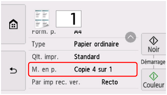 Sélectionnez Paramètres dans l'écran d'attente de copie pour afficher l'écran des paramètres d'impression, sélectionnez Copie 4 sur 1 pour M. en p., puis OK.
