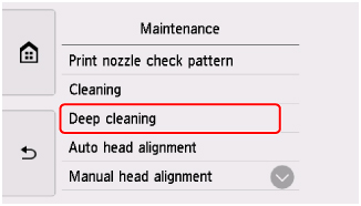 Als de afdrukkwaliteit niet is verbeterd door de normale reiniging van de printkop, moet u een diepte-reiniging van de printkop uitvoeren. Bij een diepte-reiniging van de printkop wordt meer inkt verbruikt dan bij een normale reiniging van de printkop. Het is daarom raadzaam de diepte-reiniging van de printkop alleen uit te voeren als het echt nodig is.