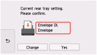 Dacă dimensiunea de pagină şi tipul de suport afişate pe ecranul senzitiv se potrivesc cu dimensiunea şi tipul plicurilor încărcate în tava din spate, selectaţi Da (Yes).