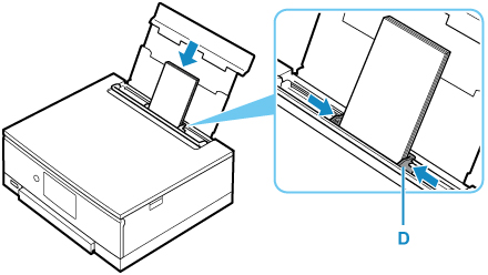 Glisaţi ghidajul pentru hârtie (D) din dreapta pentru a-l alinia cu ambele laturi ale plicurilor.