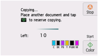 Εάν κατά τη σάρωση εμφανιστεί το μήνυμα Αποτυχία κράτησης εργασίας αντιγραφής. Ξεκινήστε από την αρχή. (Failed to reserve the copy job. Start over from the beginning.) στην οθόνη αφής (touch screen) επιλέξτε OK και πατήστε στο στοιχείο Στοπ (Stop) για να ακυρώσετε την αντιγραφή. Στη συνέχεια, αντιγράψτε τα έγγραφα για τα οποία δεν έχει ολοκληρωθεί η αντιγραφή.