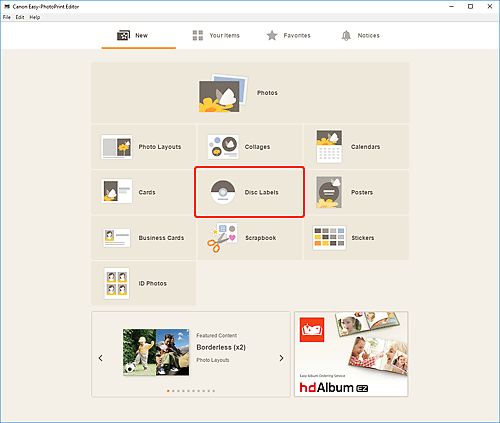 1Käivitage Easy-PhotoPrint Editor ja valige Disc Labels.