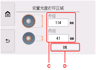 选择外径或内径(C),指定打印区域,然后选择OK(D)。