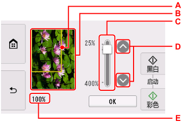 C:显示预览屏幕显示时所设置的缩放设置。 如果选择除按页面大小以外的设置,可以通过拖动触摸屏上的滑动条更改缩放设置。