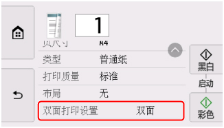 在复印待机屏幕中选择设置以显示打印设置屏幕,为双面打印设置选择双面,然后选择OK。