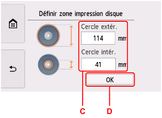 Sélectionnez Cercle extér. ou Cercle intér. (C), spécifiez la zone d'impression, puis sélectionnez OK (D).