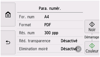 Lorsque l'écran d'attente de numérisation s'affiche, sélectionnez Para. numér. pour sélectionner le paramètre. Faites défiler pour afficher les paramètres de configuration et sélectionnez le paramètre pour afficher ses options. Sélectionnez pour spécifier le paramètre.