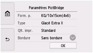 L'écran Paramètres PictBridge s'affiche. Vous pouvez modifier la qualité d'impression lorsque vous imprimez directement à partir d'un périphérique compatible PictBridge (Wi-Fi).