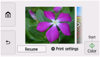 • Anda dapat melanjutkan tayangan slide dengan memilih Lanjut kembali(Resume) saat pencetakan. Jika pencetakan belum selesai, Anda dapat mencetak foto yang ditampilkan dengan menjeda tayangan slide lagi dan mengetuk Warna(Color).