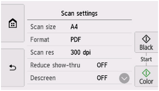 Ketika layar siaga Pindai ditampilkan, pilih Setelan Pindai(Scan settings) untuk memilih item setelan. Jentik untuk menampilkan item setelan dan pilih item setelan untuk menampilkan setelan. Pilih untuk menentukan setelan.