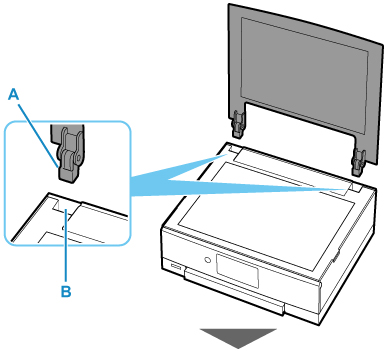 Paskan kedua engsel (A) penutup dokumen ke dalam penahan (B) dan masukkan kedua engsel penutup dokumen secara vertikal sesuai ilustrasi di bawah ini.