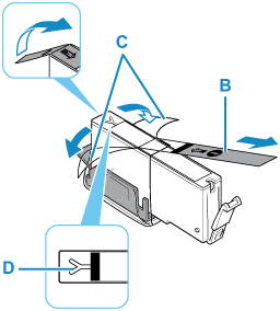 4. Ambil kotak tinta baru dari kemasannya, lepaskan pita oranye (B) seluruhnya, kemudian lepaskan lapisan pelindung (C) seluruhnya.
