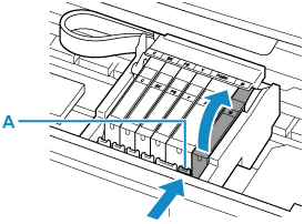 Tekan tab (A) dan angkat kotak tinta untuk mengeluarkannya.