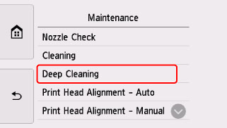 Jika kualitas cetak tidak meningkat berdasarkan pembersihan standar kepala cetak, bersihkan kepala cetak secara mendalam. Membersihkan kepala cetak secara mendalam menghabiskan lebih banyak tinta daripada pembersihan standar kepala cetak, jadi bersihkan kepala cetak secara mendalam hanya ketika diperlukan.