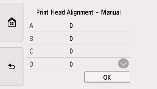 • Untuk mencetak dan memeriksa nilai penjajaran posisi kepala saat ini, pilih Ctk nilai penjajaran kepala cetak(Print the head alignment value).