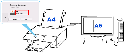 Hvis for eksempel papirinnstillingen for utskrift/kopiering er A5 og papirinformasjonen som er registrert i skriveren er A4, må du legge A5-papir i bakskuffen eller kassetten før du starter utskrift/kopiering.