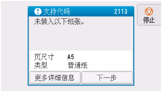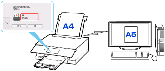 - 例如,如果用于打印/复印的纸张尺寸设置为A5,而打印机中注册的纸张信息为A4,则先在后端托盘或纸盒中装入A5尺寸的纸张,然后再开始打印/复印。