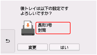 表示された用紙のサイズと種類が、後トレイにセットした封筒と同じであれば[はい]を選ぶ