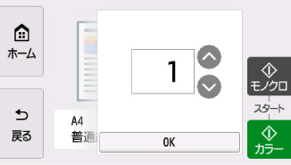 をタップして、印刷部数を指定します。タッチし続けると、10枚ずつ部数が増減します。