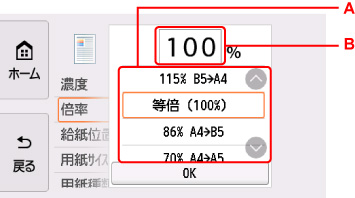 コピー待機画面で[印刷設定]を選んで印刷設定画面を表示し、[倍率]を選ぶと拡大/縮小方法が表示されます。倍率を指定して、[OK]を選びます。