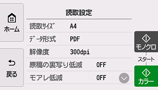 印刷物は細かな点の集まりで文字やグラフなどを表現しています。モアレとは、この点と点の干渉によって濃淡のむらや縞模様が出る現象です。スキャンした文書を確認してモアレがあるときは[ON]に設定します。