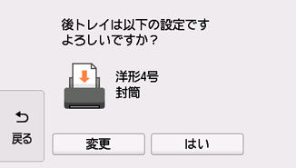 表示された用紙のサイズと種類が、後トレイにセットした封筒と同じであれば[はい]を選ぶ