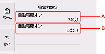 A:操作がされなかった場合やパソコンから印刷データが送られなかった場合に、自動的にプリンターの電源を切るまでの時間を設定します。
