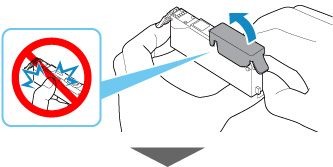 Tryk ikke på siderne af blækbeholderen. Hvis du trykker på siderne af blækbeholderen, mens det Y-formede lufthul er dækket til, kan blækket sprøjte.