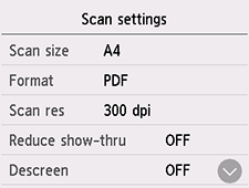 When the Scan standby screen is displayed, select Settings to select the setting item. Flick to display setting items and select the setting item to display the settings. Select to specify the setting.
