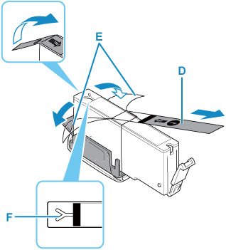 4. Sortez la nouvelle cartouche d'encre de son emballage et retirez entièrement la bande orange (D), puis décollez la totalité du film protecteur (E).