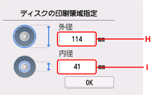 外径/内径の寸法は、プリンタブルディスクのパッケージやケース内のインデックスシートに記載されている印刷可能範囲(最小内径、最大外径)を確認するか、または印刷面の外径/内径を実際に測り、外径には計測した値より小さい数値を、内径には計測した値より大きい数値を指定してください。