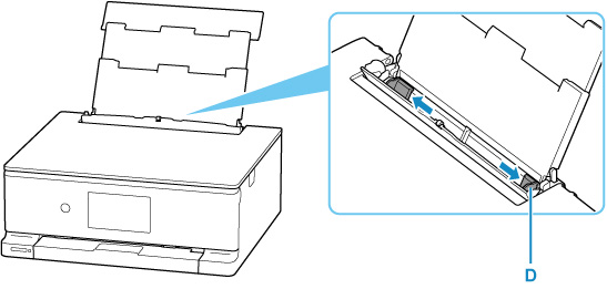 Pastumdami dešinįjį popieriaus kreipiklį (D) atidarykite abu popieriaus kreipiklius.