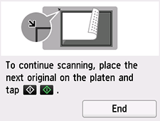 Ja skenēšanu vēlaties beigt, atlasiet Beigt (End). Skenētie dati tiks pārsūtīti uz datoru vienā PDF formāta failā.