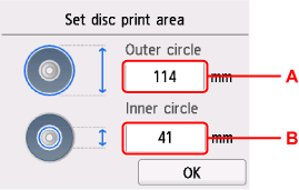• Meça os diâmetros externo e interno da superfície imprimível do disco e certifique-se de que você definiu um valor menor do que o valor medido para o diâmetro externo e um valor maior do que o valor medido para o diâmetro interno.