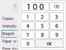 Nasledujúca obrazovka sa zobrazí, keď zvolíte možnosť Nastavenia (Settings) na pohotovostnej obrazovke kopírovania a vyberiete položku Zväčšiť (Magnif.), aby ste vybrali spôsob zmenšenia alebo zväčšenia. Zadajte zväčšenie a vyberte možnosť OK.
