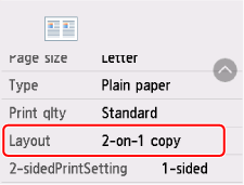 Selezionare Impostaz. (Settings) nella schermata di standby di copia per visualizzare la schermata delle impostazioni di stampa. Selezionare Copia 2 in 1 (2-on-1 copy) in Layout, quindi selezionare OK.
