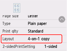 Velg Innstillinger (Settings) i ventemodusskjermbildet for kopiering for å vise utskriftsinnstillinger. Velg 4 på 1-kopi (4-on-1 copy) i Oppsett (Layout) i denne rekkefølgen, og velg OK.