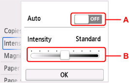 När (ON) är valt justeras intensiteten automatiskt enligt de original som har placerats på glaset.