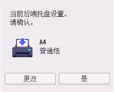例如,如果用于打印/复印的纸张尺寸设置为A5,而打印机中注册的纸张信息为A4,则在开始打印/复印前,请先在后端托盘纸盒中装入A5尺寸的纸张。