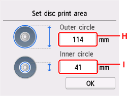 Ukur diameter luar dan dalam permukaan pencetakan dari diska dapat dicetak dan pastikan Anda mengeset nilai yang lebih kecil dari nilai yang diukur untuk diameter luar, dan nilai yang lebih besar dari nilai yang diukur untuk diameter dalam.