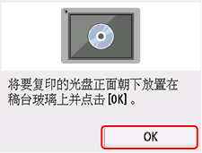 按照屏幕上的说明在稿台玻璃上放置作为复印来源的BD/DVD/CD光盘,然后选择OK。