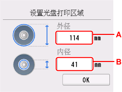 测量可打印光盘打印面的内外直径,并确保设置的值小于外径的测量值并且大于内径的测量值。