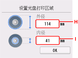 测量可打印光盘打印面的内外直径,并确保设置的值小于外径的测量值并且大于内径的测量值。