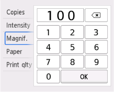選擇影印待命螢幕上的設定(Settings)後顯示以下螢幕,然後選擇縮放比例(Magnif.)以選擇縮小/放大方式。 指定縮放比例並選擇OK。