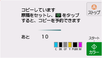 原稿の読み取り中に[コピーを予約できませんでした 最初からやり直してください]と表示された場合は、[OK]を選んでから、[ストップ]をタップし、いったんコピーを中止してください。そのあと、コピーできなかった原稿からコピーし直してください。