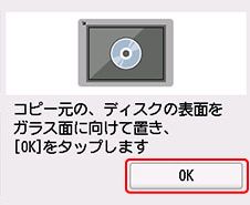 表示される案内に従って、コピー元のディスクを原稿台にセットし、[OK]を選ぶ