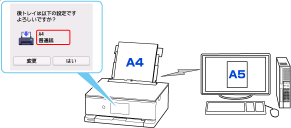 表示された用紙のサイズと種類が、後トレイにセットした用紙と同じであれば、[はい]を選びます。